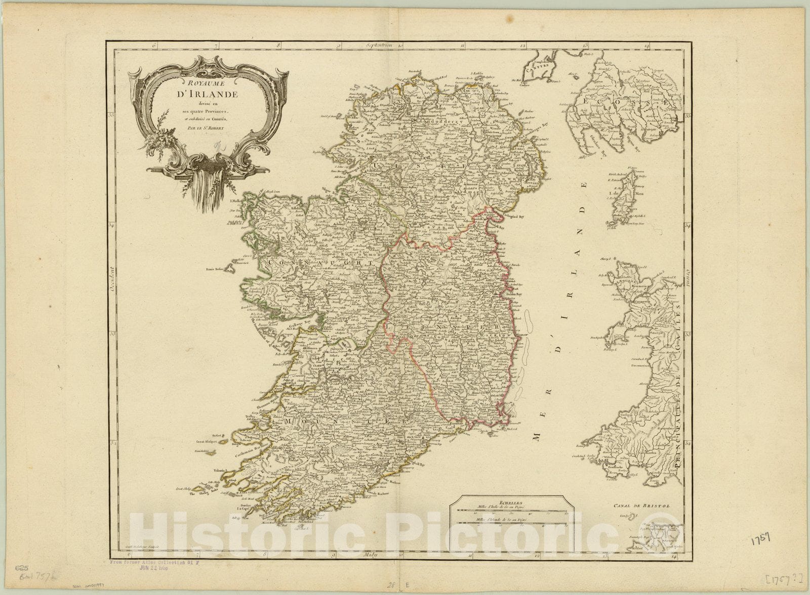 Map : Ireland 1753, Royaume d'Irlande divise en ses quatre provinces et subdivise en comtes , Antique Vintage Reproduction