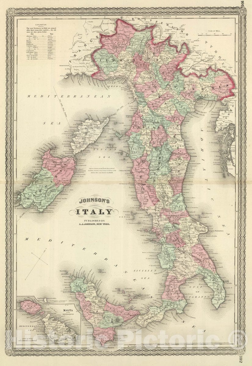 Historic Map : 1874 Johnson's Italy. Published by A. J. Johnson, New York. 101. 102. - Vintage Wall Art