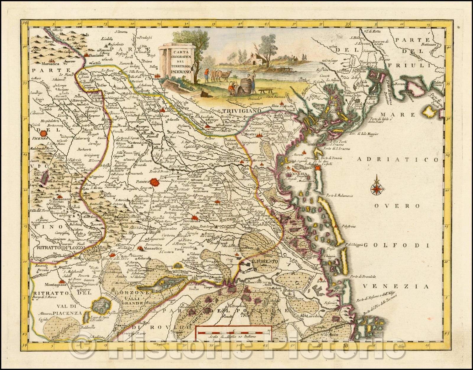 Historic Map - Carta Geografica Del Territorio Padovano/Map of part of Northern Italy, with a cartouche, 1740, Giambattista Albrizzi - Vintage Wall Art