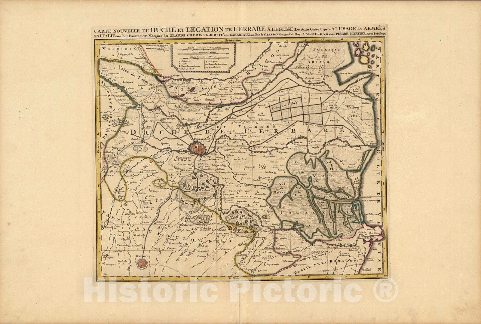 Carte Nouvelle du Duche et Legation de Ferrare. | Atlas Nouveau Contenant Toutes Les Parties du Monde, ou Sont exactement Remarques Les Empires, Monarchies, Royaumes, Estats, Republiques & Peuples qui fy trouuent a present. Par le Sr. Sanson, Geographe ordinaire du Roy. Presente a Monseigeur le Dauphin ... Hubert Jaillot Geographe du Roy. A Paris, Chez Hubert Jaillot .... | This issue of the Mortier/Jaillot Atlas Nouveau has 169 maps (1 more than the normal count of 168) plus diagrams, text pages, decorated titles and index pages. It is noted for the large number of multi-sheet "Theatre de la Guerre" (Theater of War) maps covering the battles raging in Europe and the Americas during the Spanish War of Succession (1701-1713) and the Northern War (1700-1721). The Atlas Nouveaux was first published by Jaillot in Paris in 1681(46 maps) with later issues by him in 1684 (72 maps) and 1689 (80 maps). In 1692 Pierre Mortier published his first edition of the Jaillot atlas with 99 maps, another edition followed in 1696 with 111 maps. In 1707/1708 Mortier issued our edition with 168 maps. Later editions by Mortier expanded the atlas even further - 1708, 200 maps; ca 1721, 300 maps; ca 1735, 400 maps. The atlas maps are large folio size with most maps made of two sheets and many maps combining 4 or 6 sheets (those also issued as wall maps separately). The atlas is most impressive for its large size and number of maps as well as being up to date for its time. This copy colored in outline with relief shown pictorially.