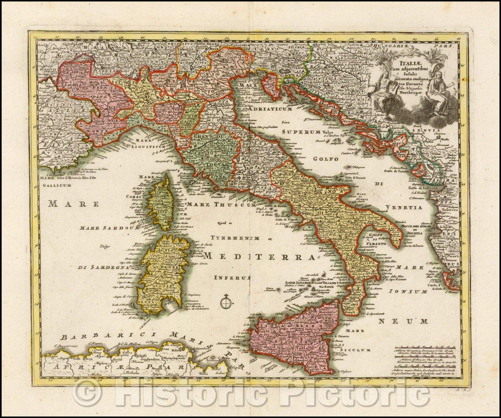 Historic Map - Italiae Cum adjacentibus Insuls accurata consignatio Curante/Since the Italian island adjacent exact depository Curante. (Modern Italy), 1718 - Vintage Wall Art