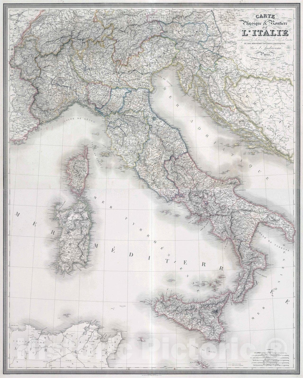 Italy, 1851 Composite Map: Carte Physique & Routiere de l'Italie. , Vintage Wall Art