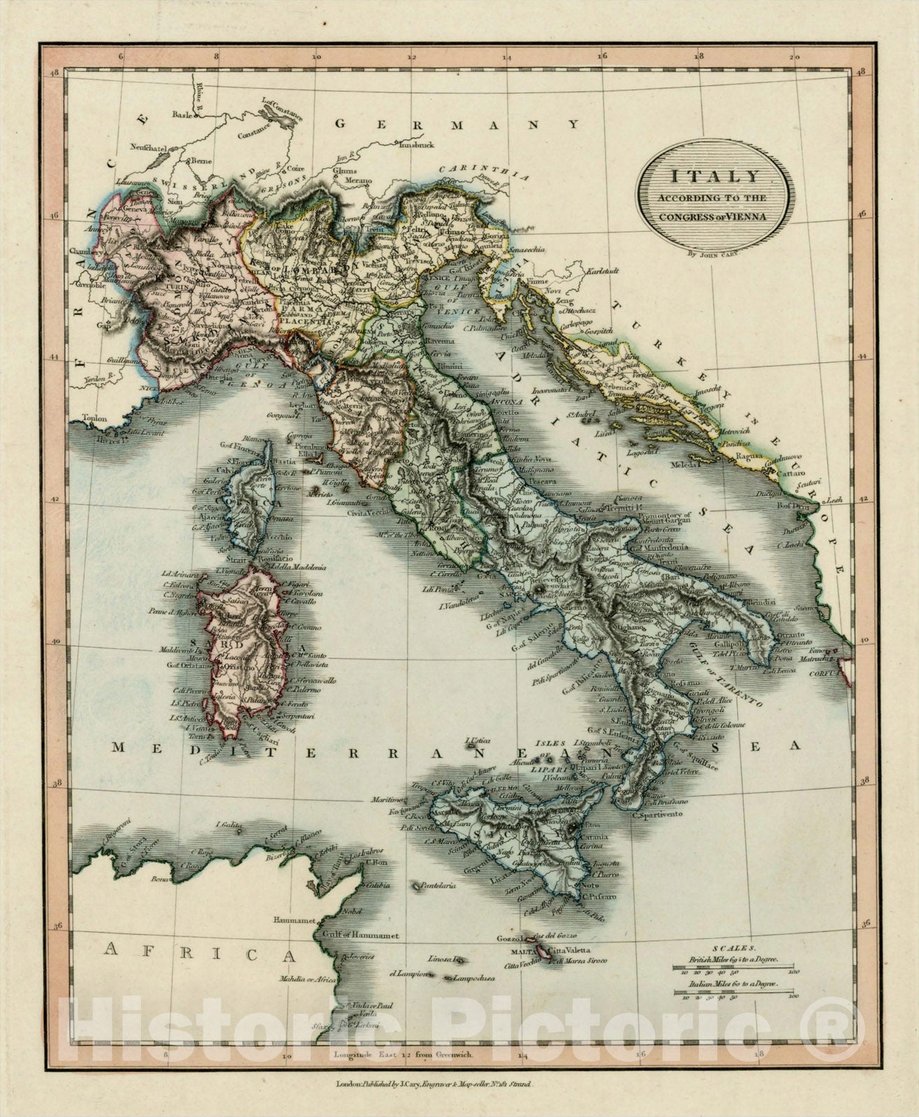 • .Historic Map : Italy According To The Congress of Vienna, 1816, John Cary, Vintage Wall Art