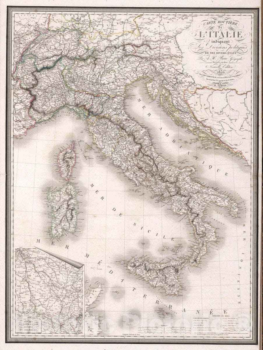 Italy, Balkan Peninsula Carte Routiere de l'Italie indiquant les divisions politiques des Divers Etats, 1830 Atlas , Vintage Wall Art