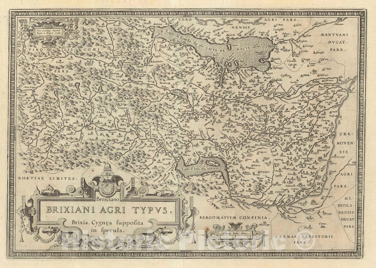 Historic Map : Italy, Bresciano Brixiani Agri Typus. Brixia, Cygnaea supposita in Specula. Cum privilegio Imperiali, Regio, et Belgico. 1590, 1590 Atlas , Vintage Wall Art