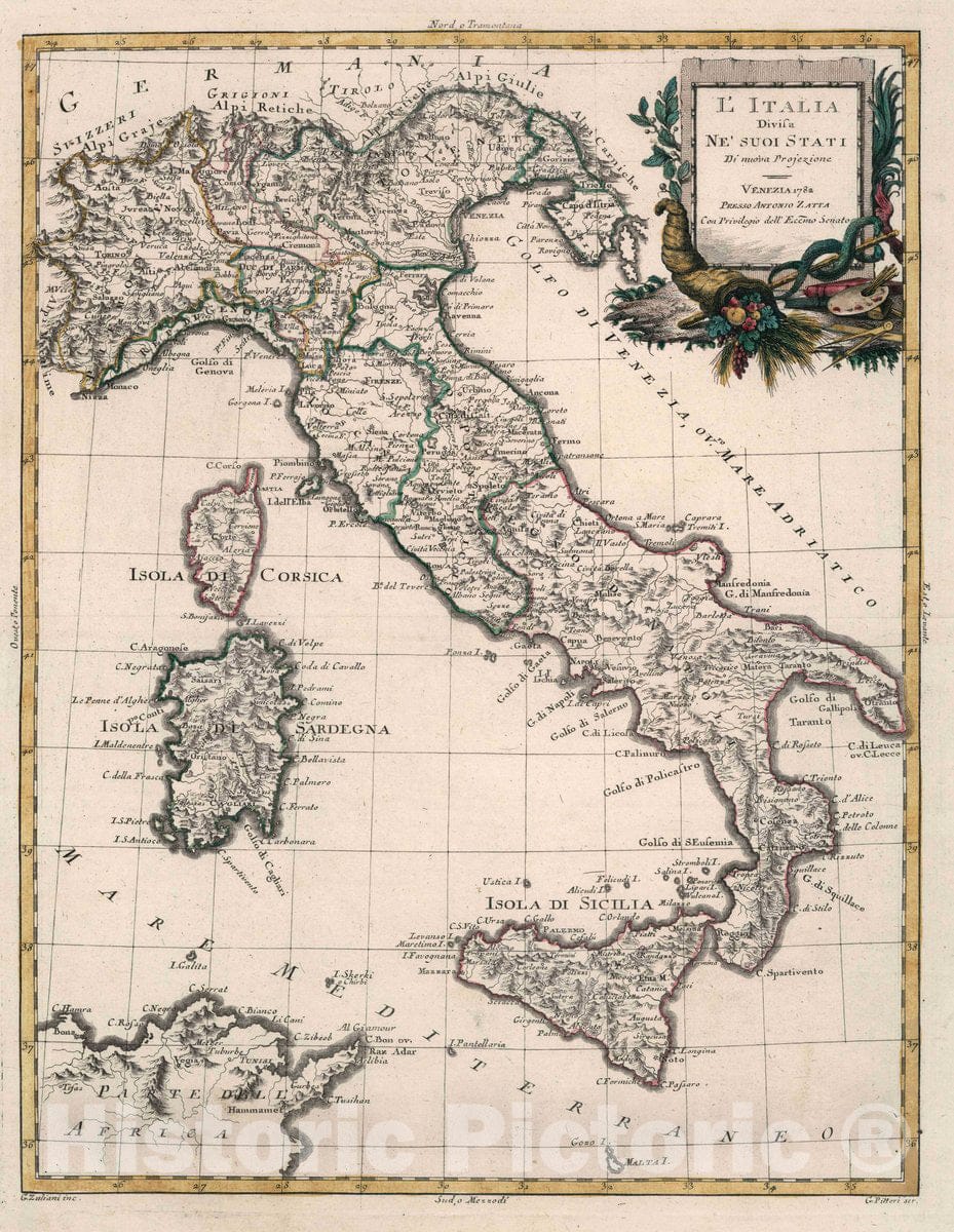 Historic Map : Italy, L'Italia : Divisa ne' suoi stati : Di Nuova projezione. Venezia 1782., Vintage Wall Art