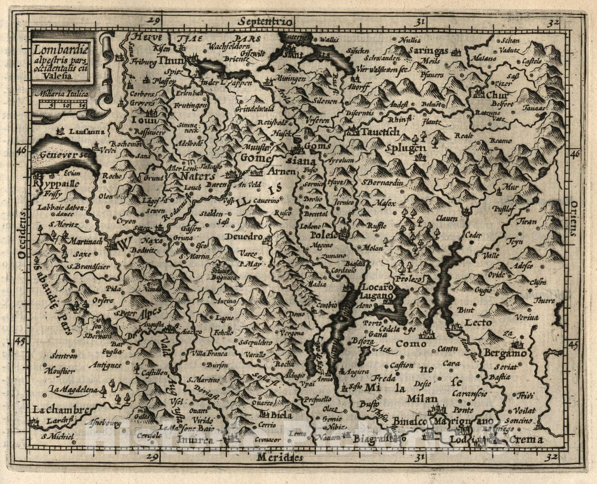 Italy, Lombardiae Alpestris pars occidentalis Cum Valesia, 1607 Atlas , Vintage Wall Art