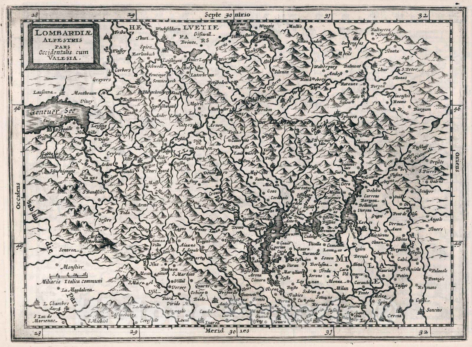 Historic Map : Italy, Lombardy (Italy)Lombardiae Alpestris pars occidentalis cum Valesia 1636 , Vintage Wall Art