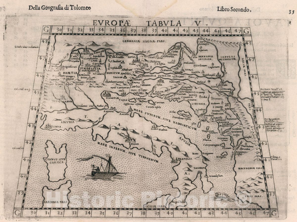 Italy, Roman Empire, Europe Tabula Europae V. Della Geografia di Tolomeo. Libro Secondo, 1599 Atlas , Vintage Wall Art