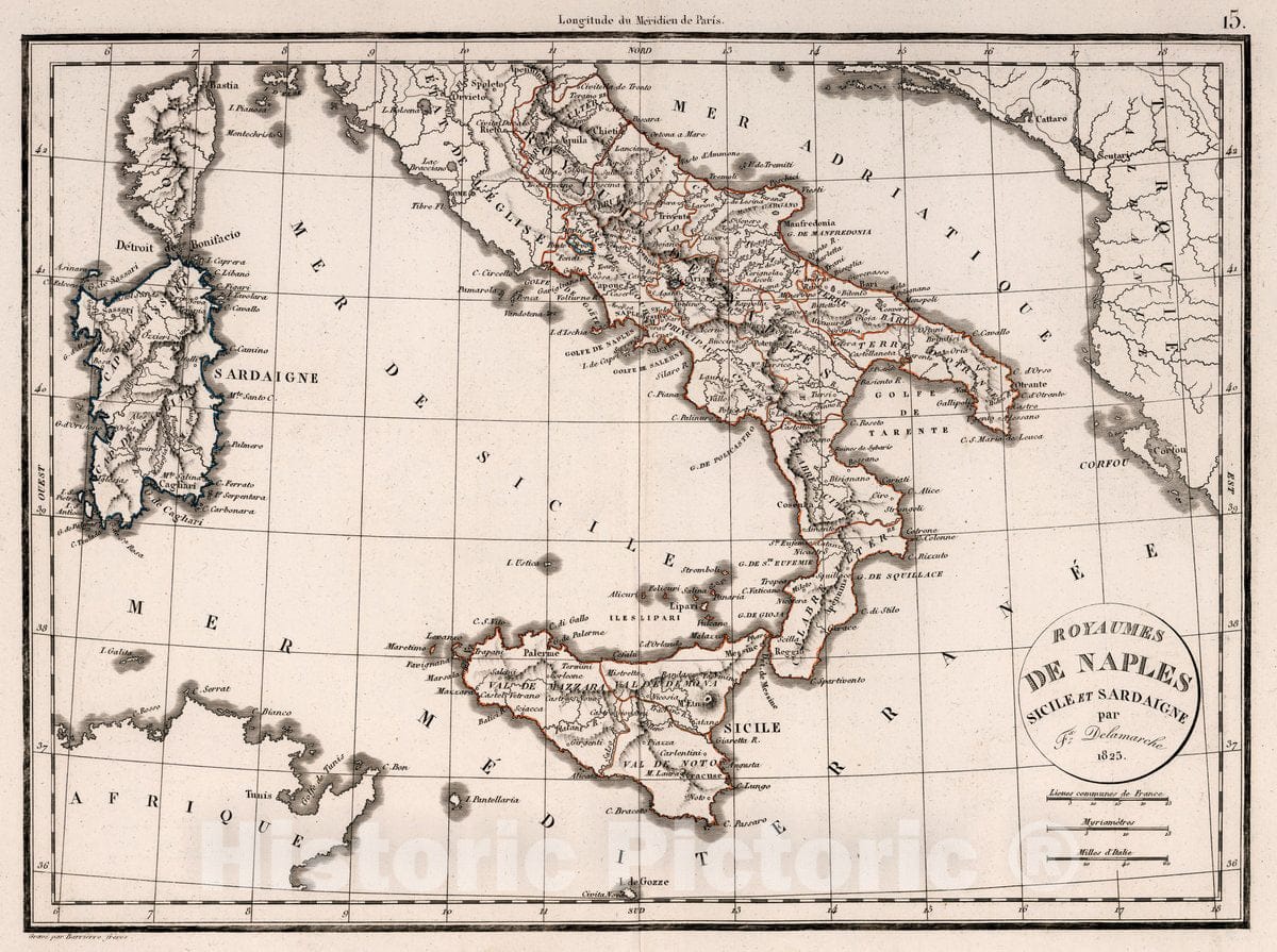 Royaumes de Naples Sicile et Sardaigne ... 1825. | Atlas De La Geographie Ancienne et moderne, Adopte Par Le Conseil Royal De l'Instruction Publique, A l'usage des Colleges Royaux et des Maisons d'Education, pour suivre les Cours de Geographie et D'Histoire; Par Felix Delamarche, Successeur De Robert De Vaugondy, Geographe Du Roi. A Paris, Chez Felix Delamarche, Ingenieur-Mecanicien Pour Les Globes Et Spheres, Rue du Jardinet, No. 13. 1826. (Annee Scolaire.) | Publisher:F. Delamarche