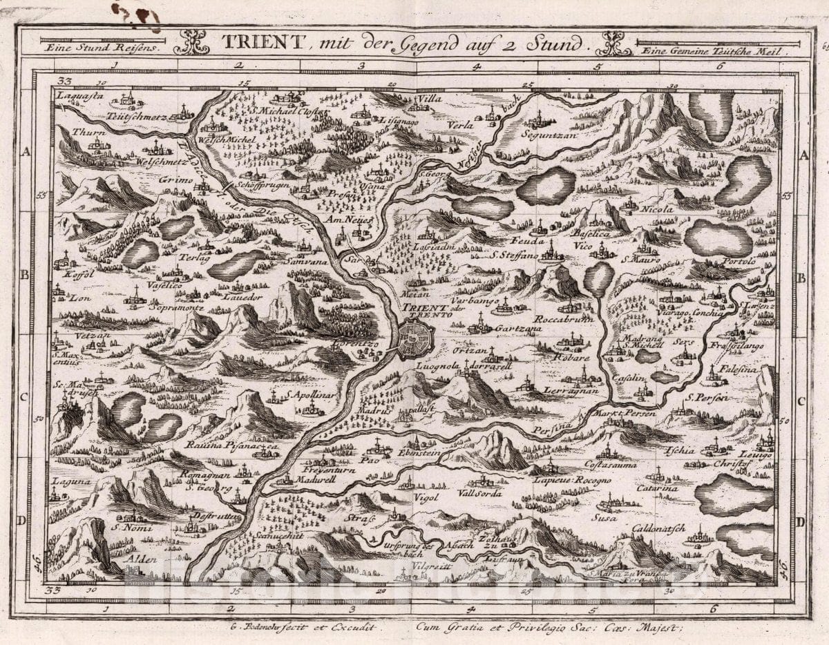 Historic Map : Italy , Trient (Italy), Europe Trient mit der Gegend auf Zwei Stunden, 1716 Atlas , Vintage Wall Art
