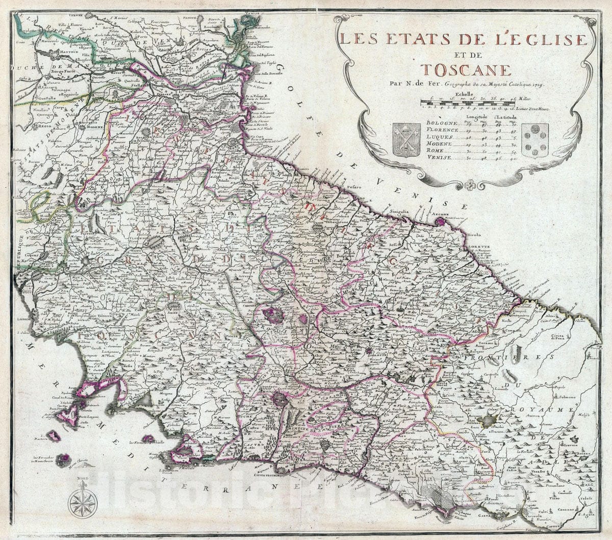 • .Historic Map : Italy, Tuscany (Italy) 1719 Les e?tats de l'e?glise et de Toscane , Vintage Wall Art