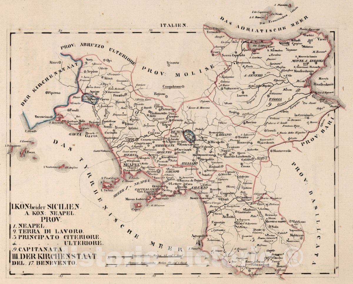 Italien. I. Kon: beider Sicilien. A. Kon: Neapel. Prov. 1 ... 4, 9... III. Der Kirchenstaa, Del. 17 Benevento. (to accompany) Atlas von Europa nebst den Kolonien : Vierzehnte Lieferung. Leipzig bei Georg Joachim Goschen 1829. | Atlas von Europa nebst den Kolonien : fur Geschaftsmanner, Zeitungsleser und Besitzer des Conversations-Lexicons in einer Folge von Charten und einem alphabetisch eingerichteten Texte : bearbeitet von W. E. A. v. Schlieben ... Leipzig bei Georg Joachim Goschen 1825. O. Hermann, Lith. | Publisher:Georg Joachim Goschen