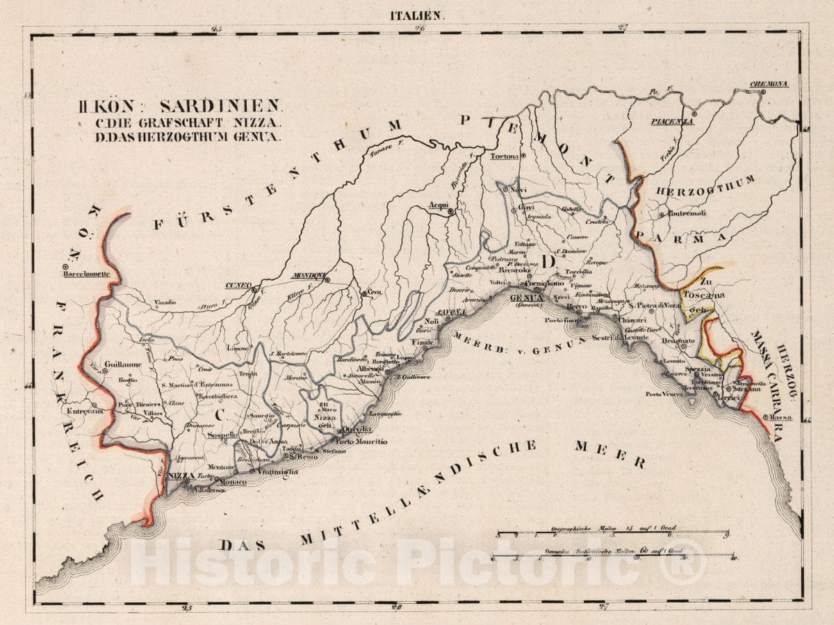Italien. II. Das konigreich Sardinien. C. Die Grafschaft Nizza. D. Das Herzogthum Genua. (to accompany) Atlas von Europa nebst den Kolonien : Vierzehnte Lieferung. Leipzig bei Georg Joachim Goschen 1829. | Atlas von Europa nebst den Kolonien : fur Geschaftsmanner, Zeitungsleser und Besitzer des Conversations-Lexicons in einer Folge von Charten und einem alphabetisch eingerichteten Texte : bearbeitet von W. E. A. v. Schlieben ... Leipzig bei Georg Joachim Goschen 1825. O. Hermann, Lith. | Publisher:Georg Joachim Goschen