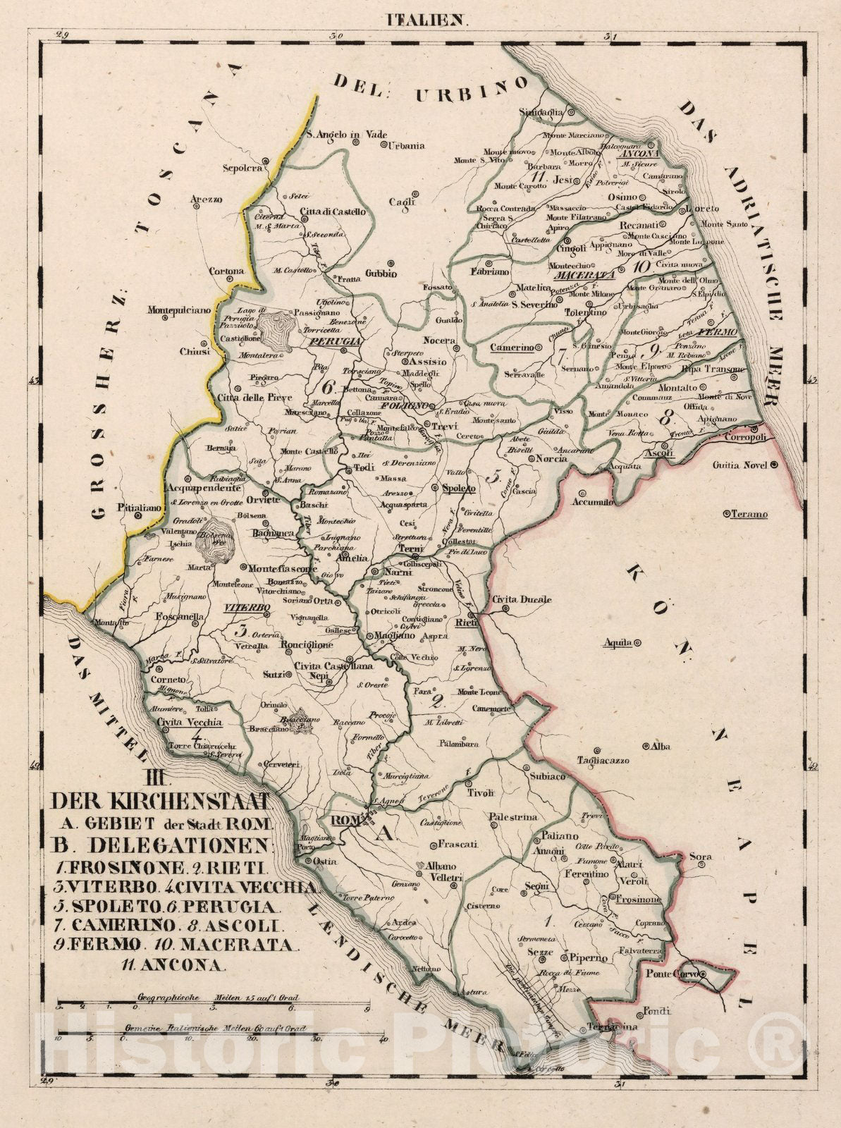 • .Historic Map : Italy, V.3:11-15:XIV. Italien. III. Der Kirchenstaat 1829 , Vintage Wall Art