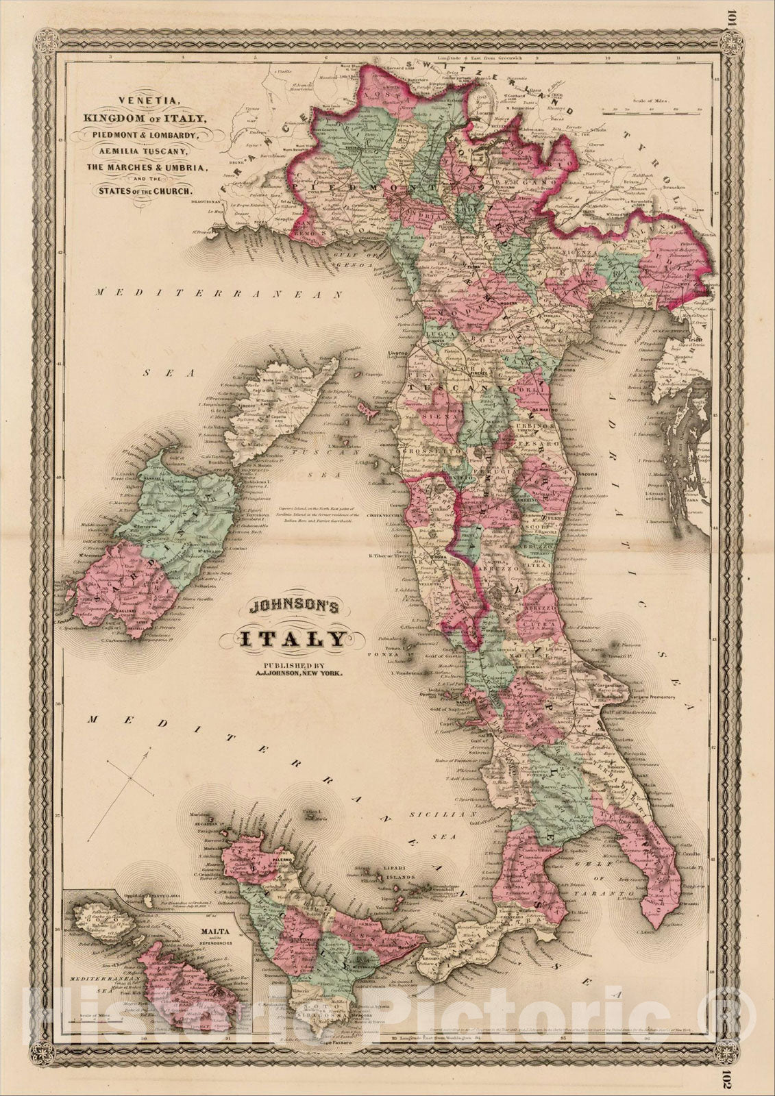 • .Historic Map : Johnson's Italy. Venetia, Kingdom of Italy, Piedmont and Lombardy, Aemilia Tuscany, the Marches & Umbria, and the States of the Church, 1870, Vintage Wall Art
