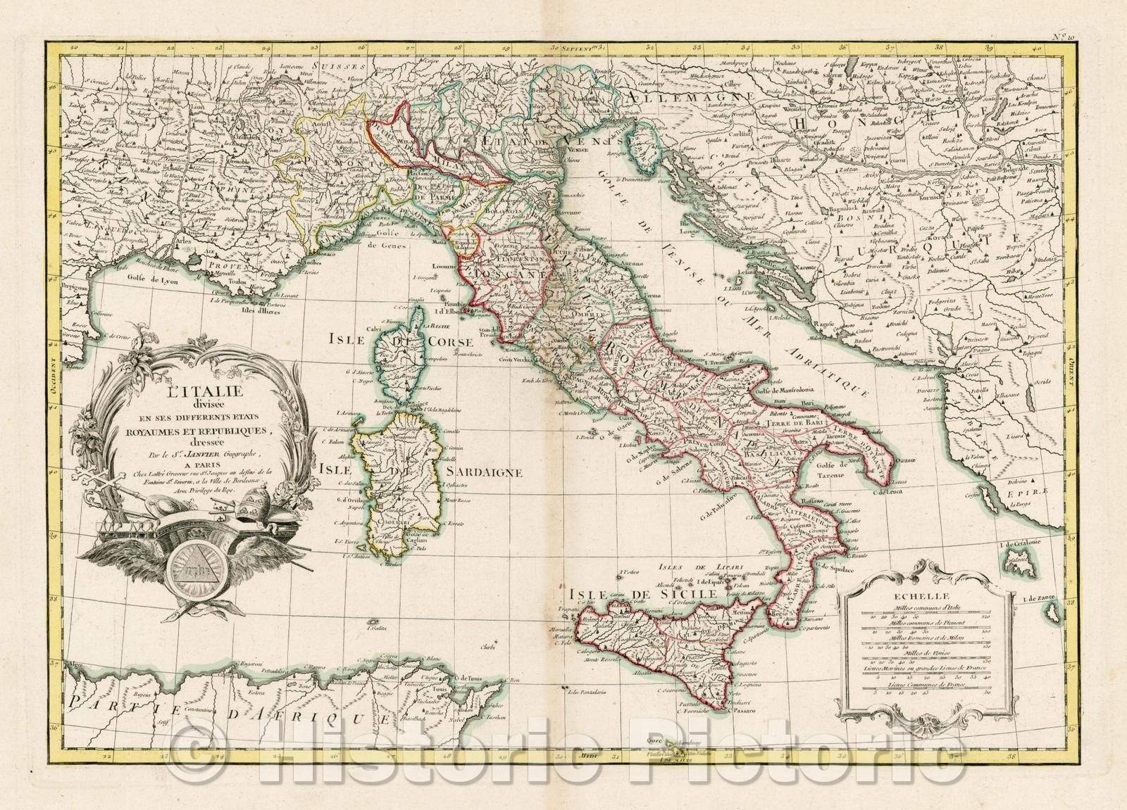 Historic Map - L'Italie divisee en ses differents etats Royaumes Et Republiques/Map of Italy, cartouche. Nice detail throughout, 1762, Jean Janvier - Vintage Wall Art