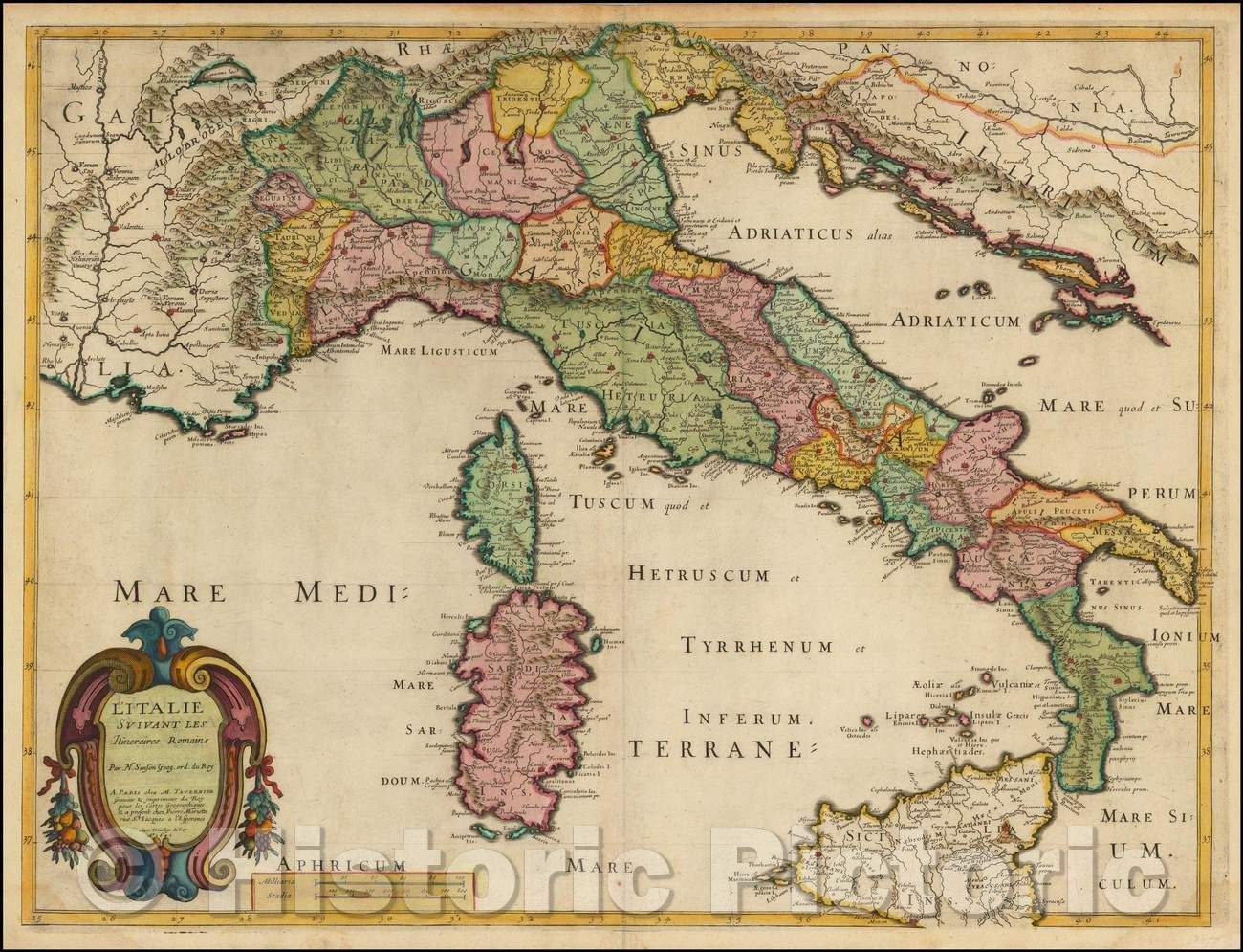 Historic Map - L'Italie Suivant Les Itineraires Romains/Map of Italy, 1641, Melchior Tavernier - Vintage Wall Art