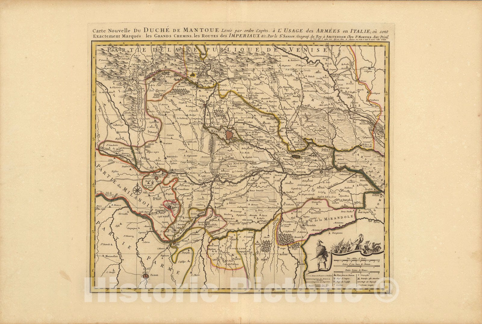 Carte Nouvelle du Duche de Mantoue. | Atlas Nouveau Contenant Toutes Les Parties du Monde, ou Sont exactement Remarques Les Empires, Monarchies, Royaumes, Estats, Republiques & Peuples qui fy trouuent a present. Par le Sr. Sanson, Geographe ordinaire du Roy. Presente a Monseigeur le Dauphin ... Hubert Jaillot Geographe du Roy. A Paris, Chez Hubert Jaillot .... | This issue of the Mortier/Jaillot Atlas Nouveau has 169 maps (1 more than the normal count of 168) plus diagrams, text pages, decorated titles and index pages. It is noted for the large number of multi-sheet "Theatre de la Guerre" (Theater of War) maps covering the battles raging in Europe and the Americas during the Spanish War of Succession (1701-1713) and the Northern War (1700-1721). The Atlas Nouveaux was first published by Jaillot in Paris in 1681(46 maps) with later issues by him in 1684 (72 maps) and 1689 (80 maps). In 1692 Pierre Mortier published his first edition of the Jaillot atlas with 99 maps, another edition followed in 1696 with 111 maps. In 1707/1708 Mortier issued our edition with 168 maps. Later editions by Mortier expanded the atlas even further - 1708, 200 maps; ca 1721, 300 maps; ca 1735, 400 maps. The atlas maps are large folio size with most maps made of two sheets and many maps combining 4 or 6 sheets (those also issued as wall maps separately). The atlas is most impressive for its large size and number of maps as well as being up to date for its time. This copy colored in outline with relief shown pictorially.