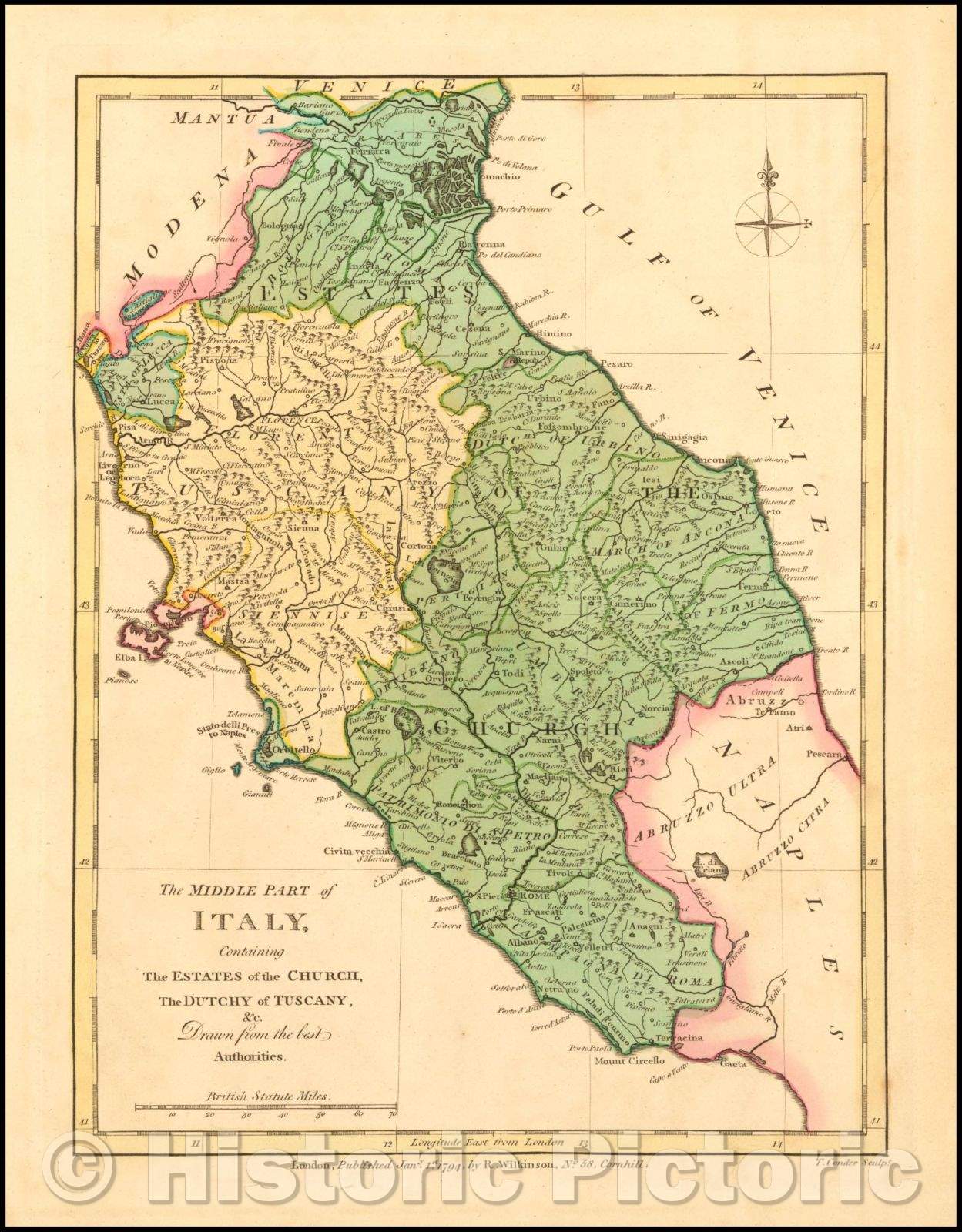 • .Historic Map - The Middle Part of Italy, Containing The Estates of the Church, The Dutchy of Tuscany, 1794, Robert Wilkinson - Vintage Wall Art