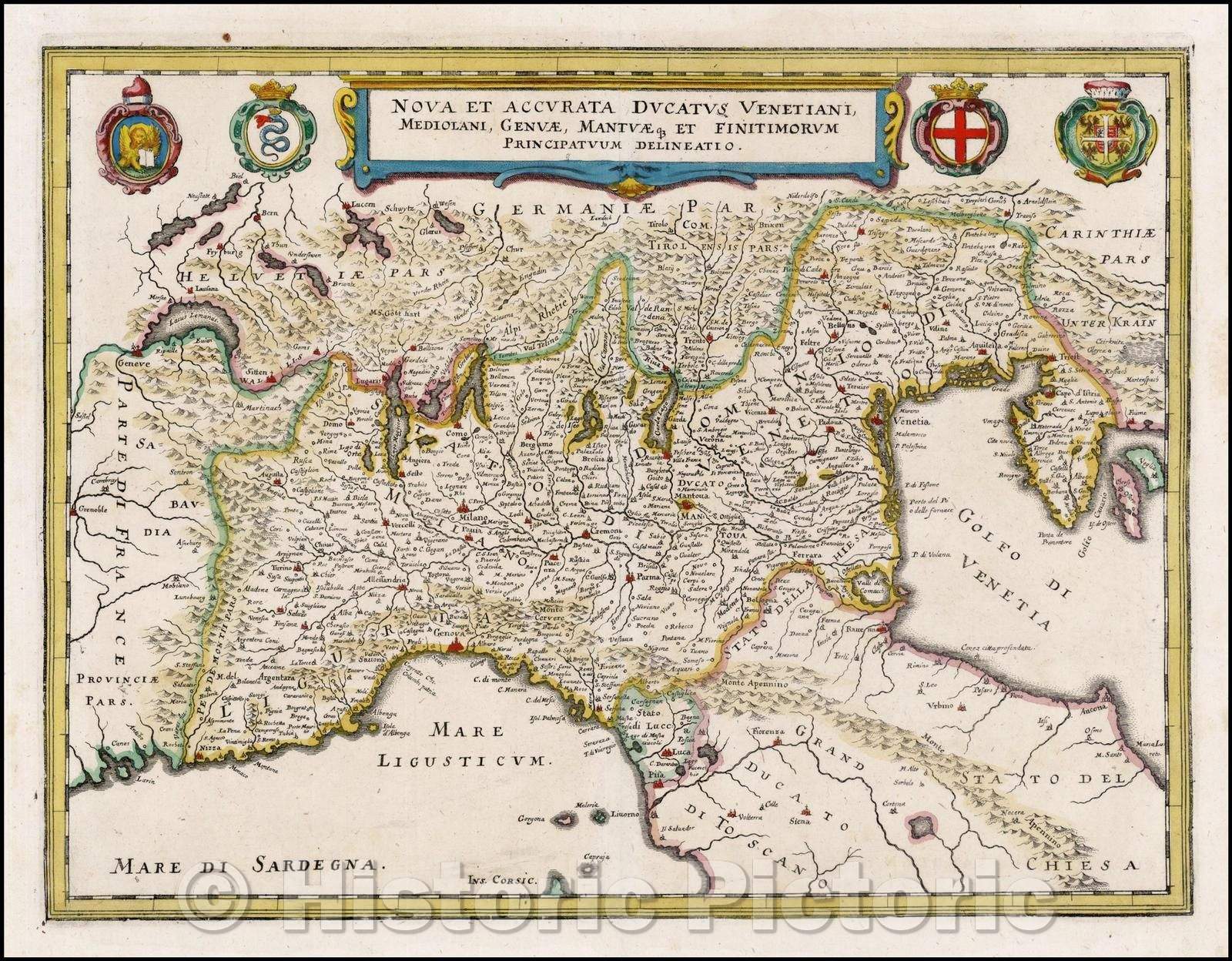 Historic Map - Nova et Accurata Ducatus Venetiani, Mediolani, Genuae, Mantuae/Map of the north part of Italy, including 4 coats of arms, 1638 - Vintage Wall Art