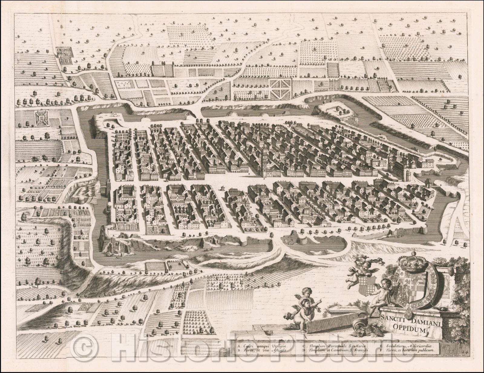 Historic Map - San Damiano D'Asti Sancti Damiani Oppidum/birdseye of San Damiano D'Asti in the Piedmont region of Northern Italy, 1688 - Vintage Wall Art