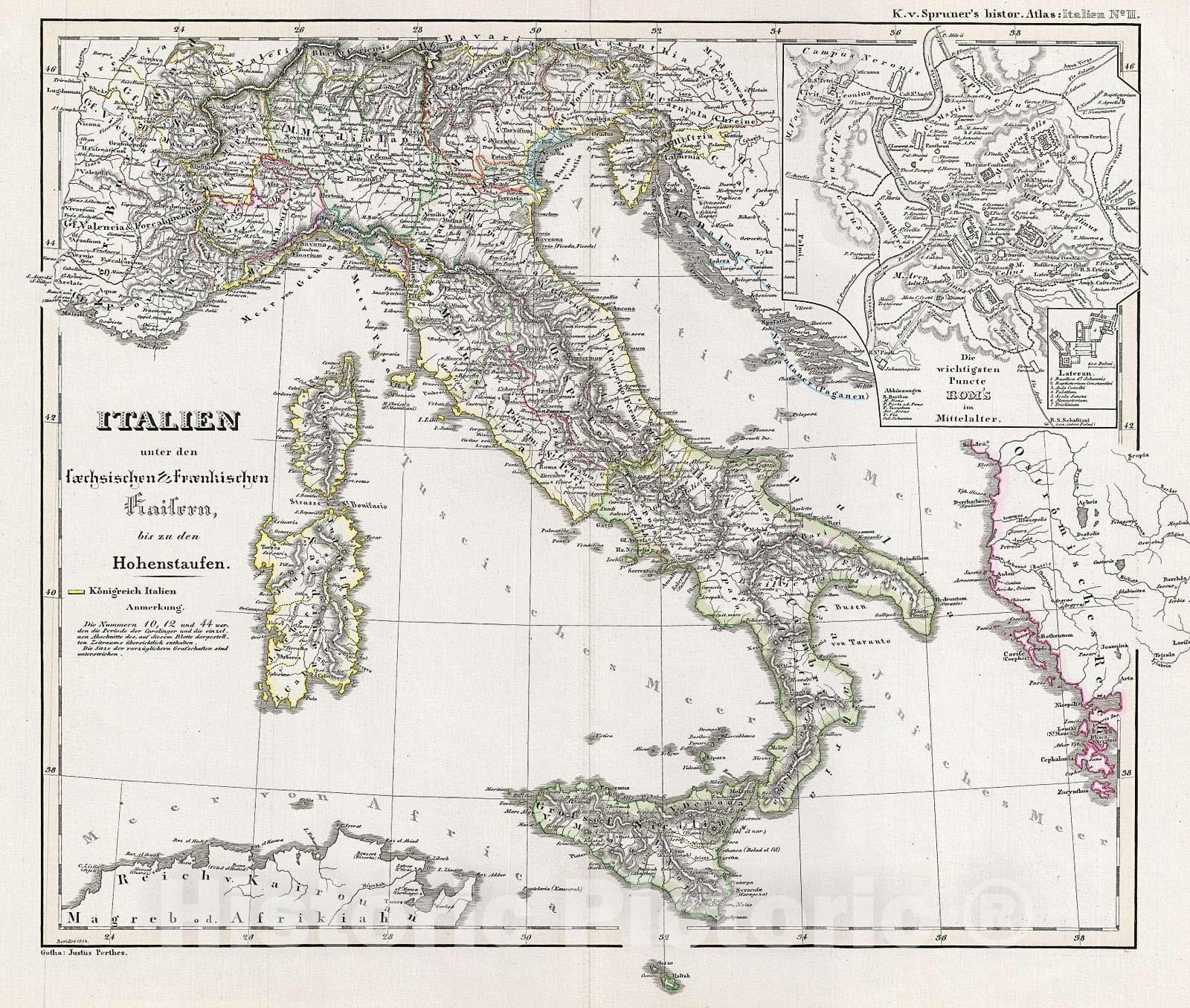 This is Karl von Spruner's 1854 historical map of Italy under the Sain xon and Frankish emperor, to the rise of the Germanic Hohenstaufen Dynasty. The map covers all Italy from the Trentino-Alto Adige region to Malta and includes Corsica and Sardinia. An inset map on the top right corner details Rome during the Middle Ages. The map depicts a time when Italy was ruled by the Franks and Sain xons, until, in 1194, the Hohenstaufens became Kings of Sicily. The whole is rendered in finely engraved detail exhibiting throughout the fine craftsmanship of the Perthes firm. Prepared by Karl Spruner for publication as plate It II in the second edition of Justus Perthes' 1854 Historich-Geographischer, Hand-Atlas zur Geschichte der Staaten europa's vom Anfang des Mittelalters bis auf die Neueste Zeit.