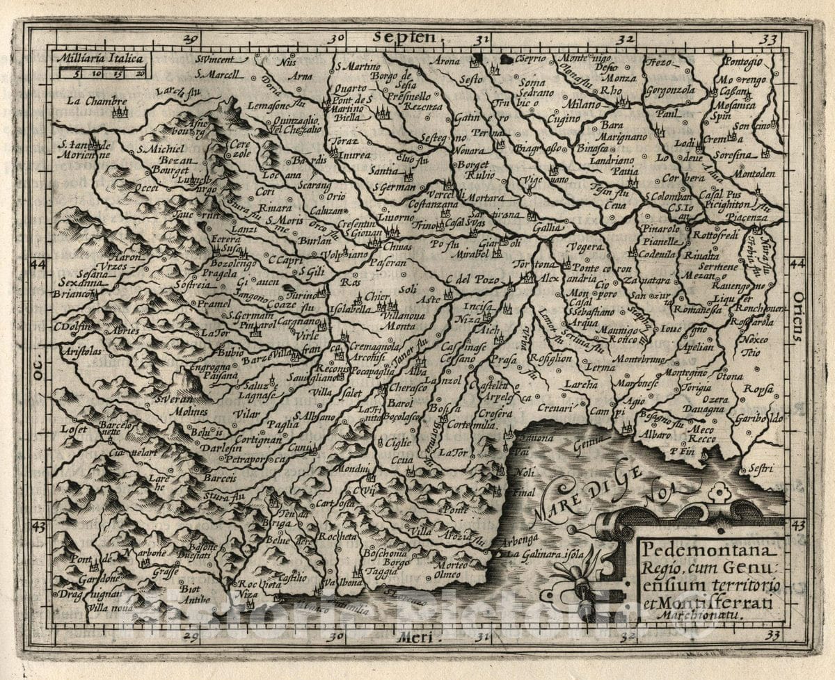 Historic Wall Map : Italy, Pedemontana Regio, Cum Genuensium territorionet Montiferrati Marchionatu, 1607 Atlas , Vintage Wall Art