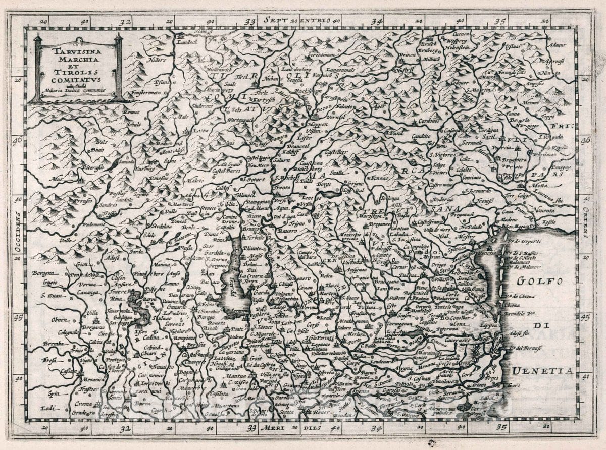 Historic Wall Map : Italy, Tarvisina Marchia et Tirolis Comitatus, 1636 Atlas , Vintage Wall Art