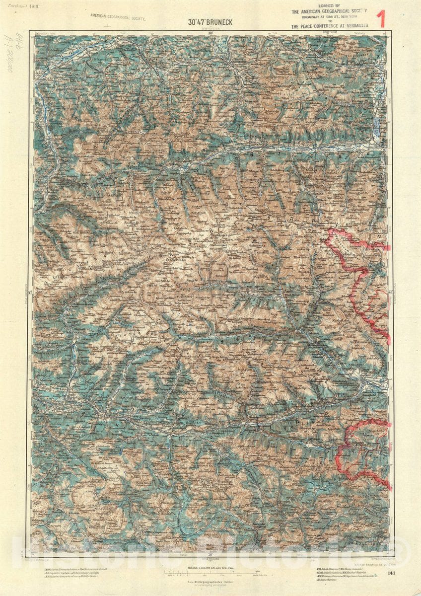 Map : Bruneck, Italy 1916, Generalkarte von Mitteleuropa, Antique Vintage Reproduction