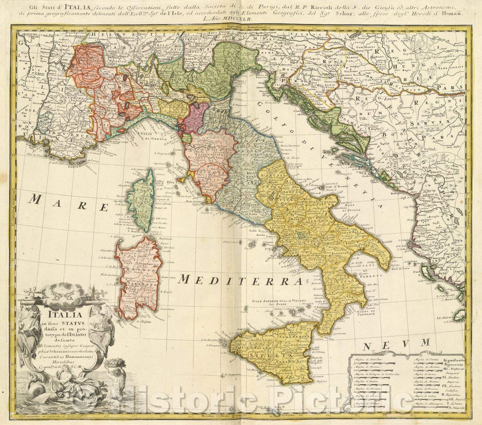 Historic Map : Italia in suos status divisa et ex prototypo del'Islanio desumta... :: Italy divided into its states and chosen from a draw by de l'Isle., 1742 , Vintage Wall Art