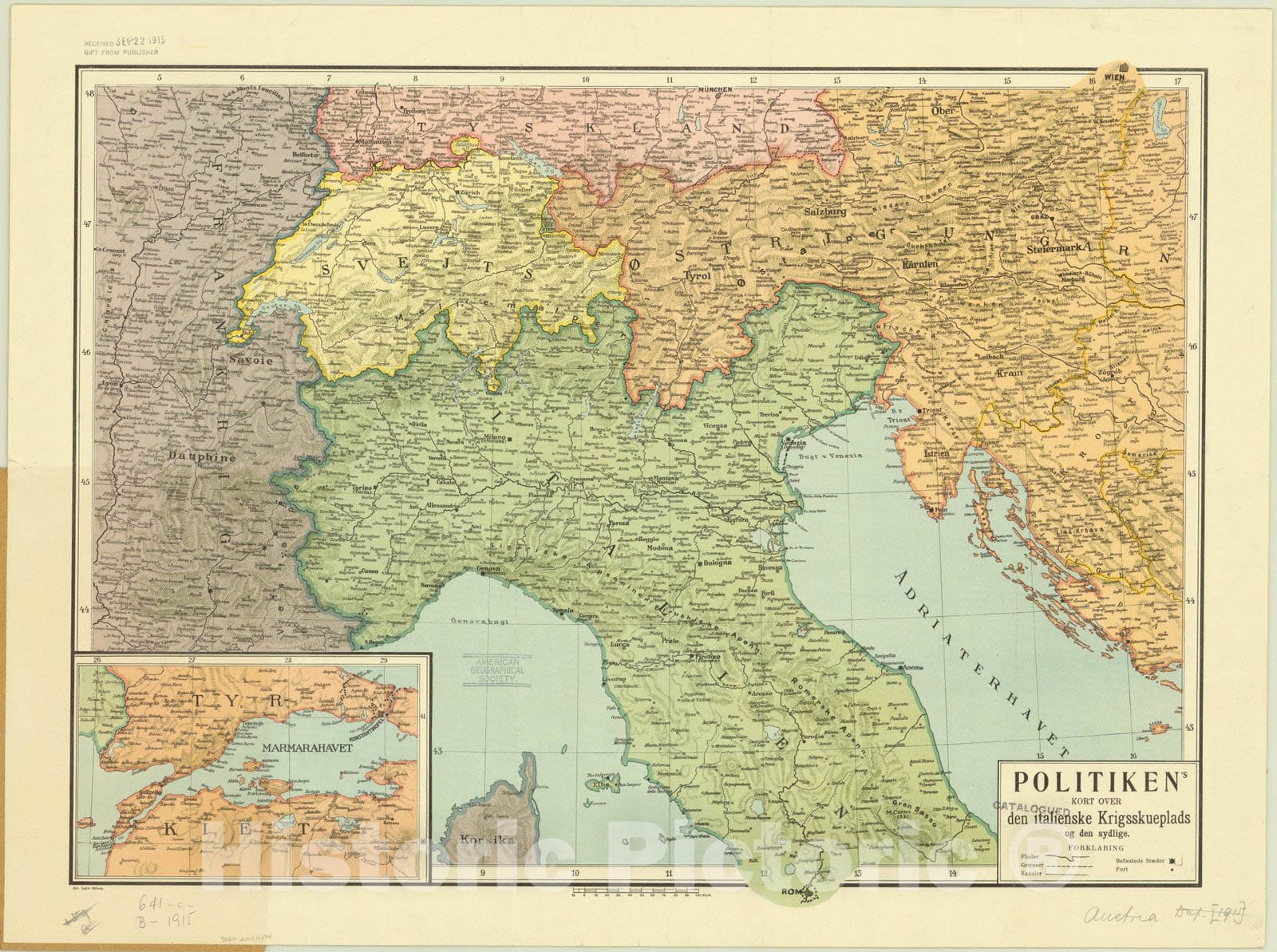 Map : Italy 1915, Politiken kort over den italienske Krigsskueplads og den sydlige, Antique Vintage Reproduction
