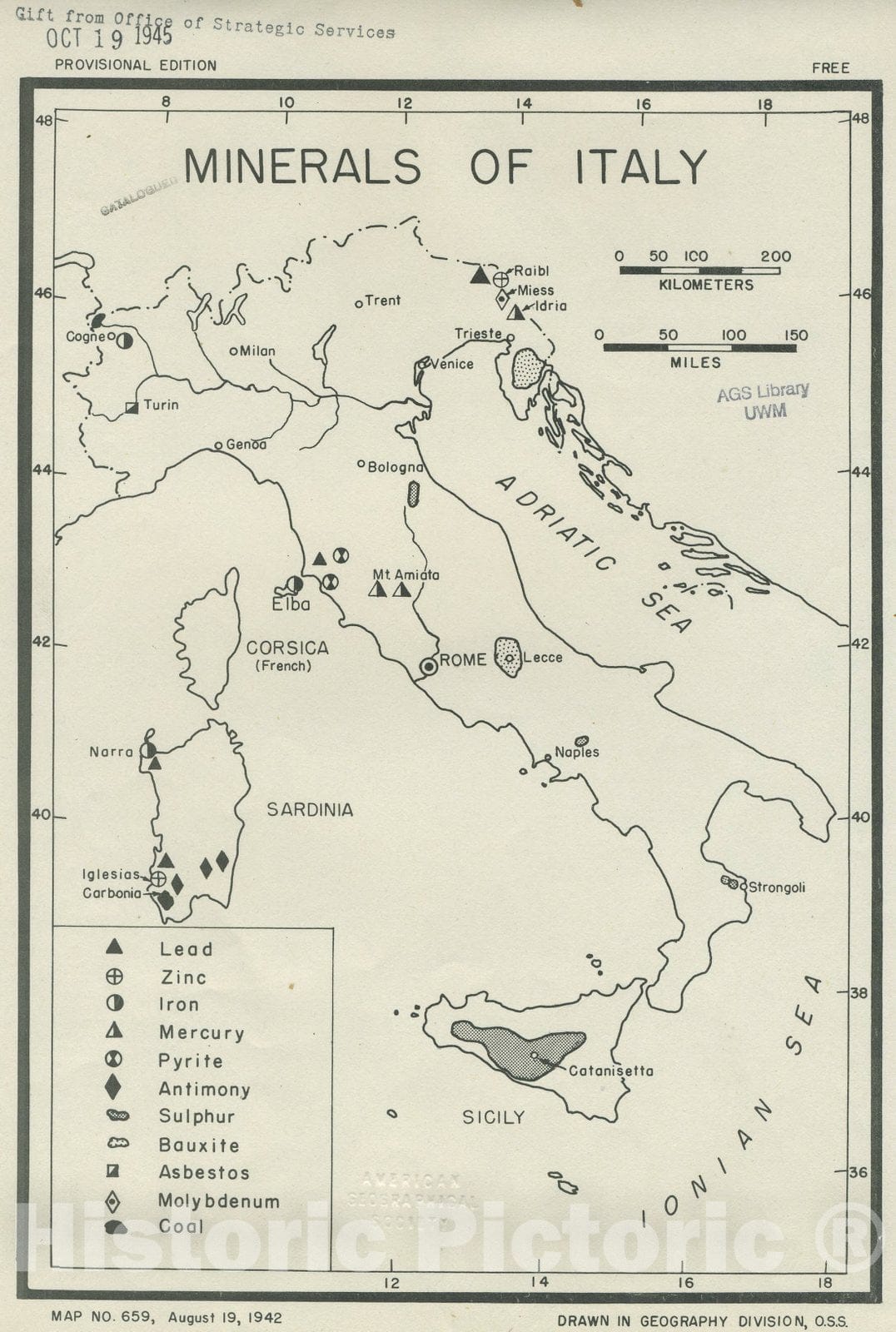 Map : Italy 1942, Minerals of Italy , Antique Vintage Reproduction