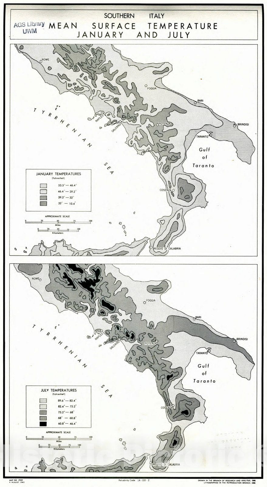 • .Map : Italy 1943, Southern Italy, mean surface temperature, January and July , Antique Vintage Reproduction