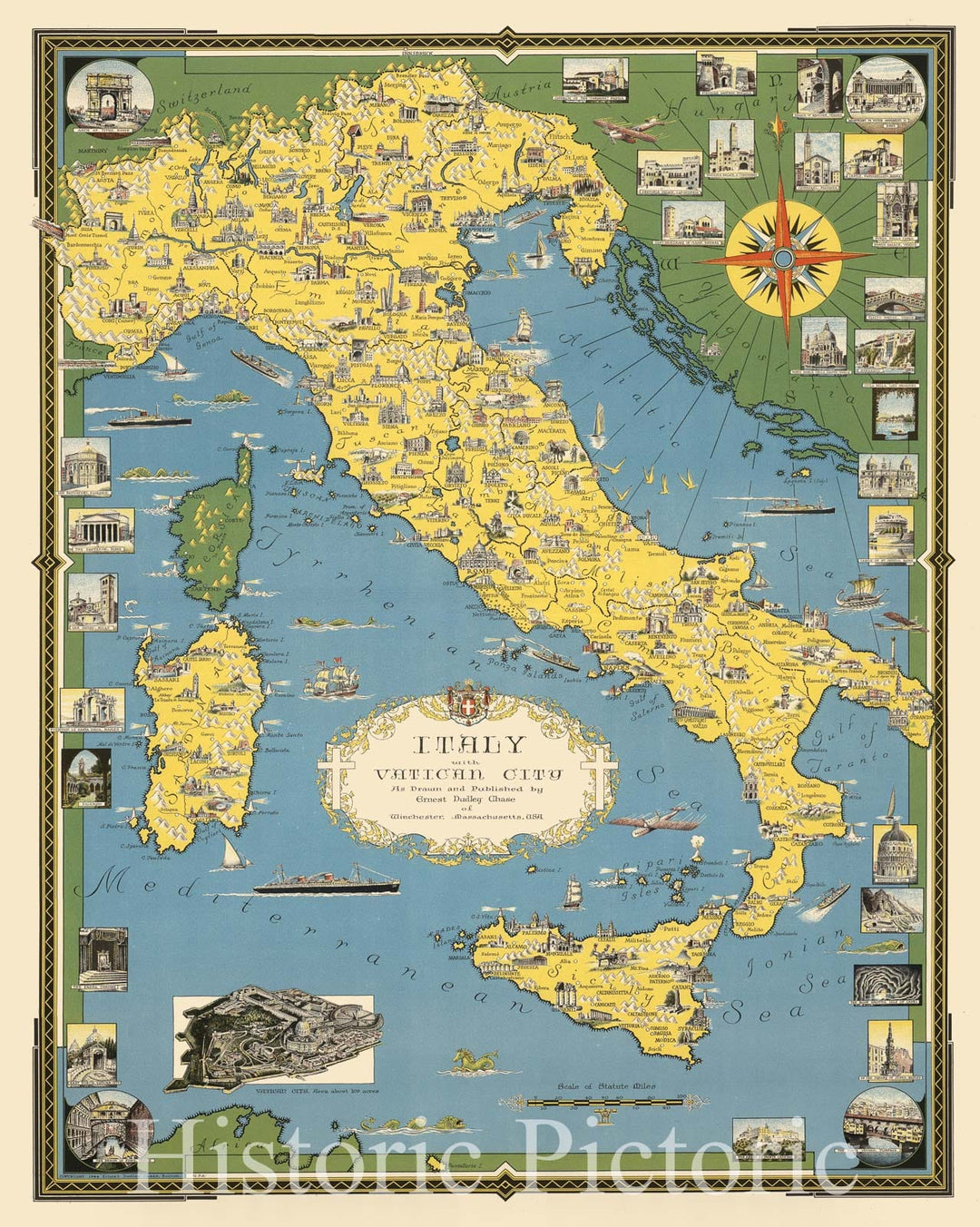 Map : Italy 1940, Italy with Vatican City , Antique Vintage Reproduction