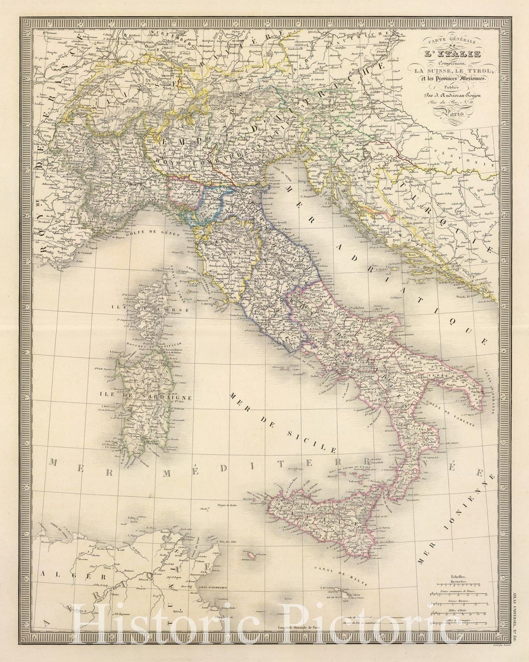 Historic Map : Italy; Switzerland, 1850 L'Italie. , Vintage Wall Art