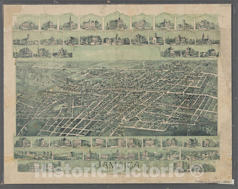 • .Historic Map - 1895 Queens, New York City, Bird'S Eye View Of Jamaica. Border Views Of Important Buildings - Vintage Wall Art
