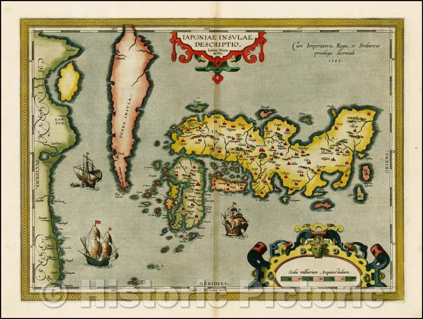 • .Historic Map - Iaponiae Insulae Descriptio Ludoico Teisera auctore [1st State!]/Japan islands Description Ludoico Teisera by [1st State!], 1595, Abraham Ortelius - Vintage Wall Art