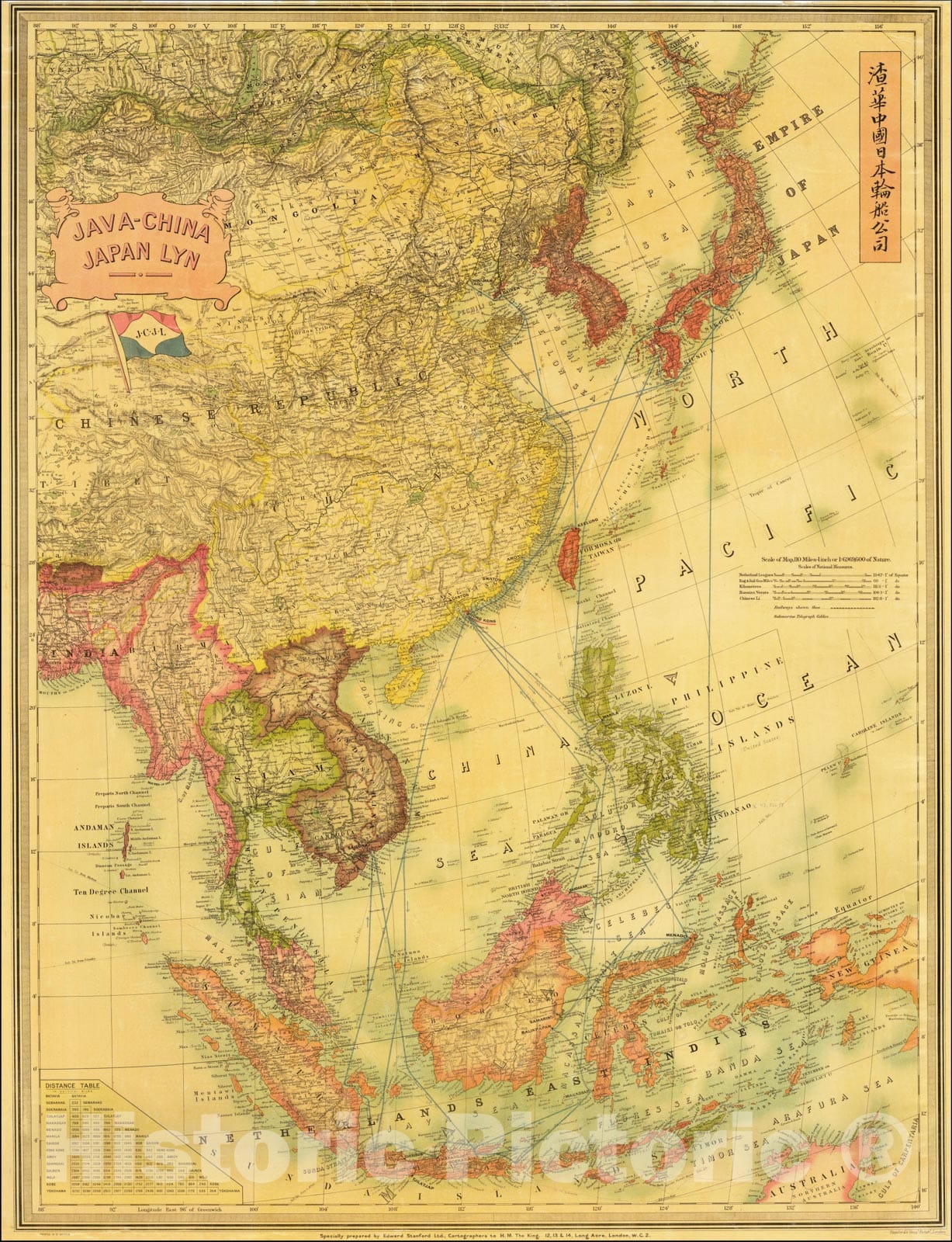 Historic Map : Java-China Japan Lyn (Map Showing Routes Ports of Call and Services of the Java-China Japan Line, 1930, Edward Stanford, Vintage Wall Art