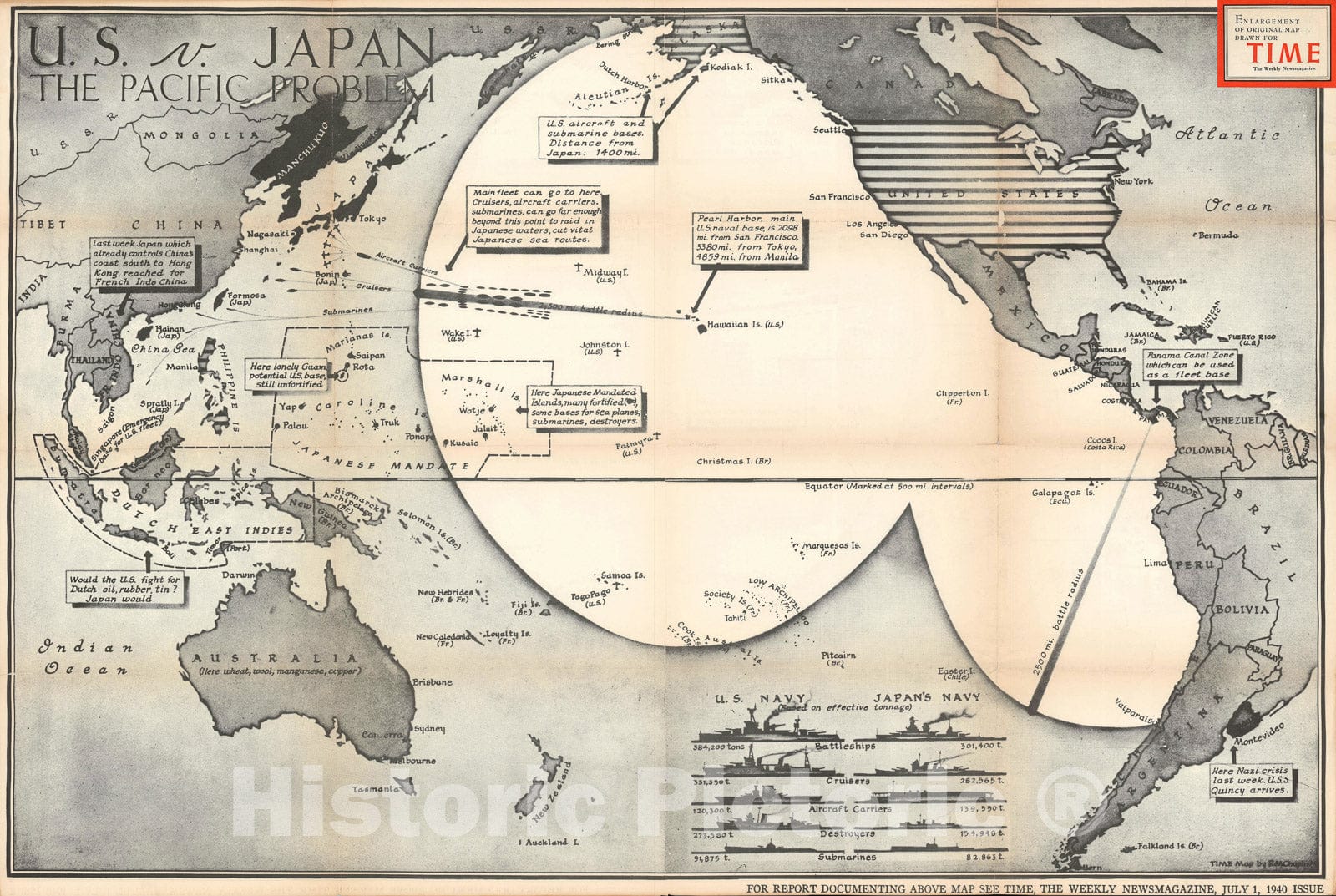 Historic Map : The Pacific and a Potential War Between The U.S. and Japan, Chapin, 1940, Vintage Wall Art