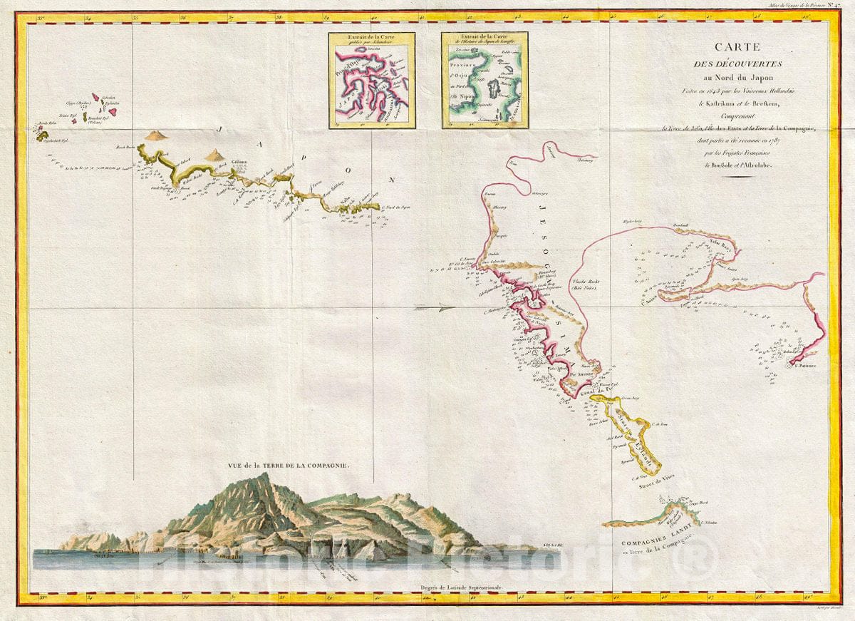 The Laperouse expedition was the first significant European exploration of this region since the 17th century treasure hunting voyage of Dutchmen Maerten de Vries and Cornelis Jansz Coen. The Perouse expedition closely followes the Vries-Coen voyage, which it references in the title, skirting the same coast, sighting the same islands, and making many of the same errors. While more detailed than the earlier maps associated with the Vries-Coen voyage, it offers little new information of significance save, perhaps, a few new soundings and the fine view of Terre de la Compagnie in the lower left quadrant. Like Vries and Coen, the Laperouse expedition failed to identify Hokkaido as an island and tentatively joines it to the southern forks of Sakhalin. Also like Vries and Coen, Laperouse fails to explore Compagnie (Iturup) but follows cartography with an excessive and erroneous mapping of the island. This map was engraved by Herault and published as plate no. 47 in the 1797 French edition of the Atlas du voyage de La Perouse