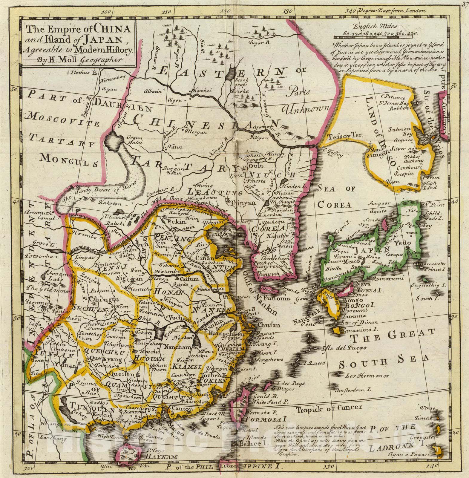 The Empire of China and island of Japan, agreeable to modern history. By H. Moll Geographer. (Printed and sold by T. Bowles next ye Chapter House in St. Pauls Church yard, & I. Bowles at ye Black Horse in Cornhill, 1736?) | Atlas minor: or a new and curious set of sixty-two maps, in which are shewn all the empires, kingdoms, countries, states, in all the known parts of the earth; with their bounds, divisions, chief cities & towns, the whole composed & laid down agreable to modern history. By Herman Moll, Geographer. (3rd ed.) London, Printed for Thos. Bowles in St. Pauls Church Yard & John Bowles at the Black Horse in Cornhill (1736?) | Contains 62 hand col. double-page engraved maps (10 folding). Contemporary ink inscription on front blank endpaper. Newer full polished calf with original gilt-lettered red leather label. A few minor repairs. The Atlas Minor was first published in 1729 and reprinted in 1732. This ed. has new engraved title-page with contents and revised maps. The maps in the third ed. are similar to those of the 2nd, except that a number of the American maps contain added place names. Like most of Moll's works, the majority of the maps are undated, although the maps of Great Tartary (no. 32) and "The West Part of Barbary" (no. 41) are dated 1732. The deciding factor which makes this copy the 3rd. ed. is map no. 13 (Germany) which carries the added legend, "Lorrain was ceded to France A.D. 1736 ..." Includes 29 maps of Europe, 10 of Asia, 5 of Africa and 18 of the Americas, including the double-hemisphere world map (no. 1) and the map of America (no. 45) that show California as an island.
