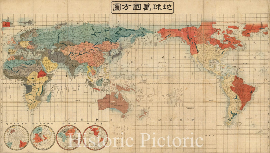 Historic Map - Japanese World Map, Shintei - Chikyu Bankoku Hozu Square Map of all the Countries on the Globe), 1852, Suido Nakajima - Vintage Wall Art