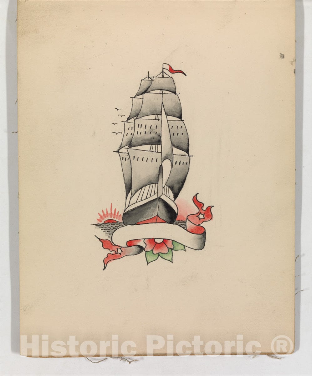 Tattoo Design with a Ship - American, active 20th century - Artist Nationality: American - Original Medium, Materials or Technique: Pen and ink and watercolor