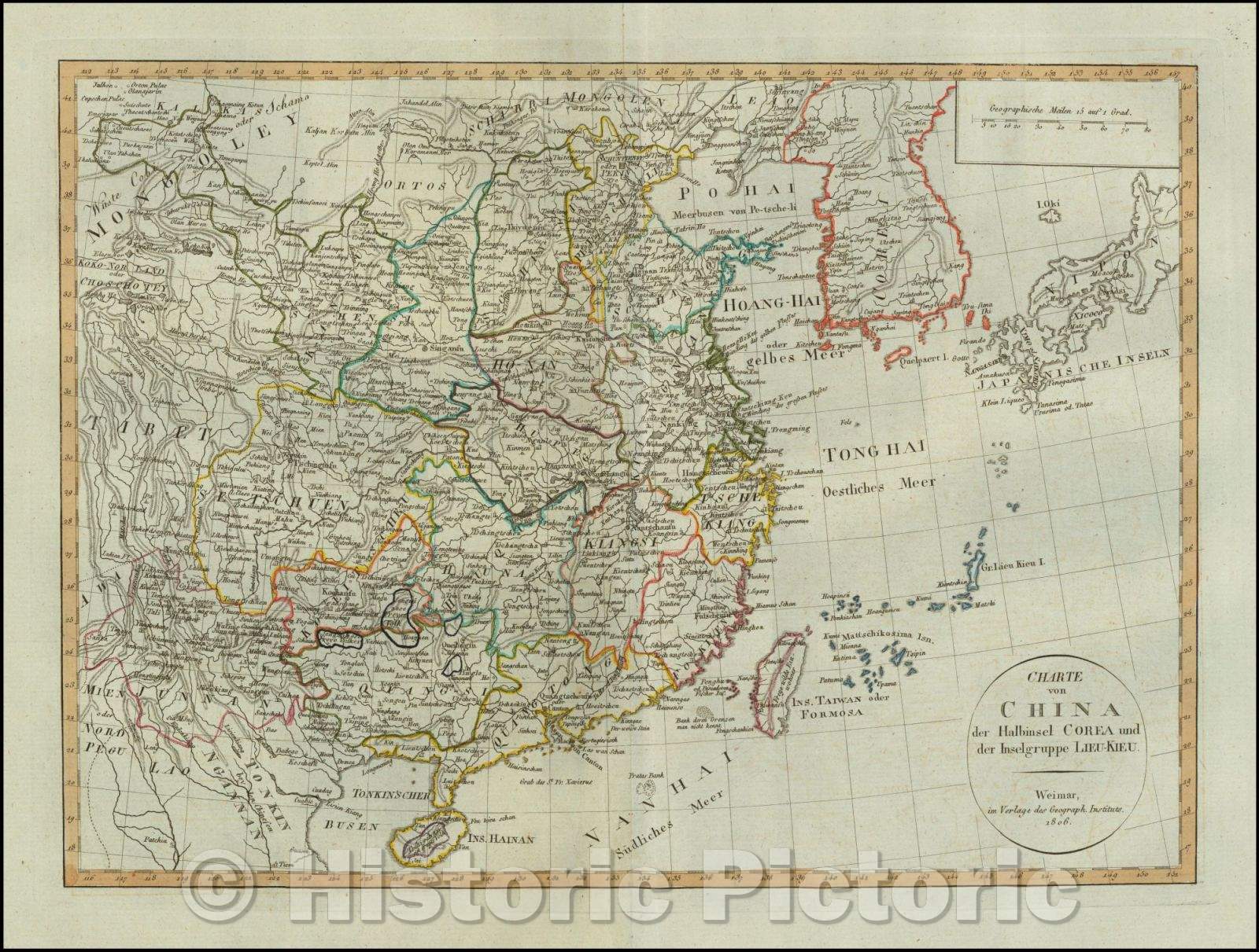Historic Map - Charte von China der Halbinsel Corea und der Inselgrupper Lieu-Kieu/Map of China and Korea, 1806, Weimar Geographische Institut - Vintage Wall Art