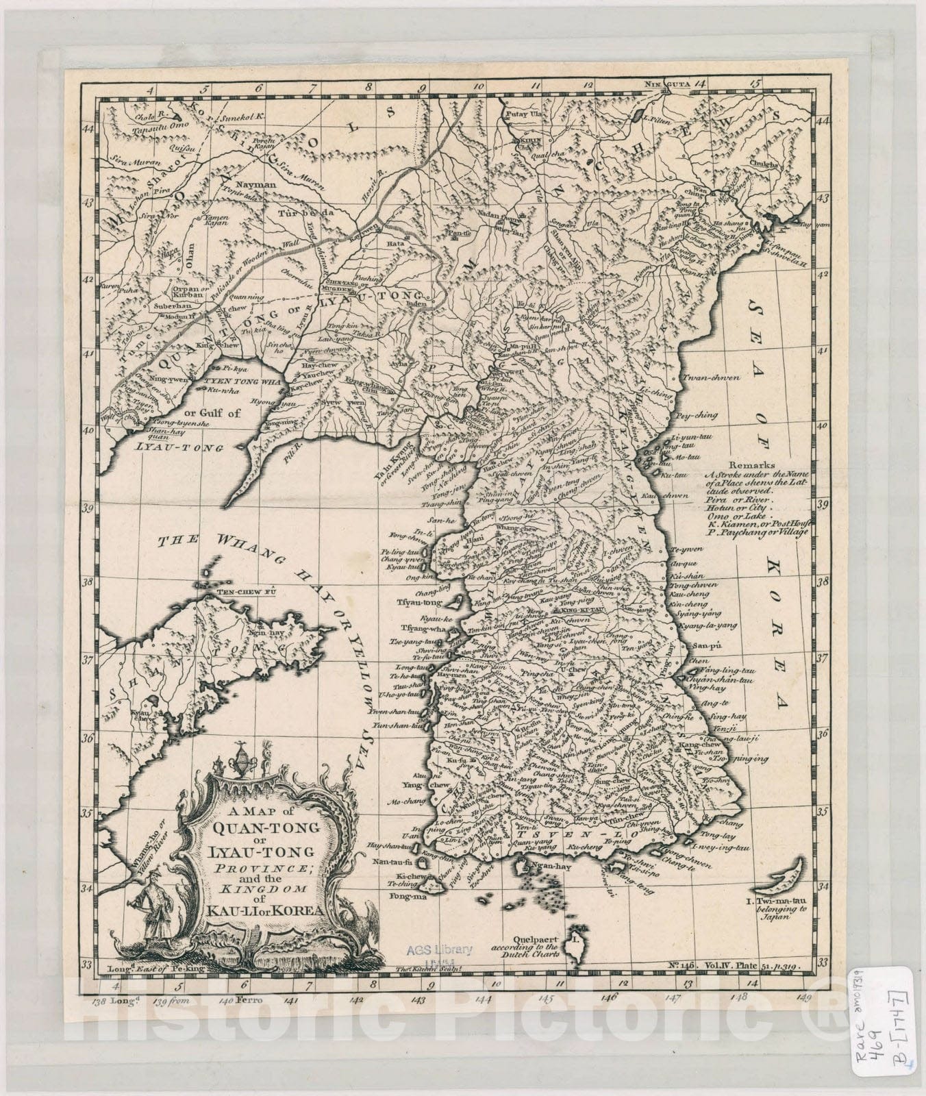 Map : Korea 1747, A map of Quan-Tong or Lyau-Tong province ; and the kingdom of Kau-Li or Korea , Antique Vintage Reproduction