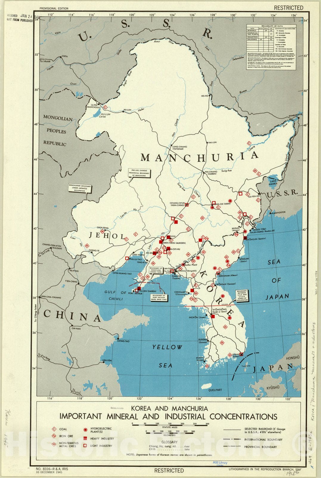 Map : Korea and Manchuria 1945, Korea and Manchuria : important mineral and industrial concentrations , Antique Vintage Reproduction