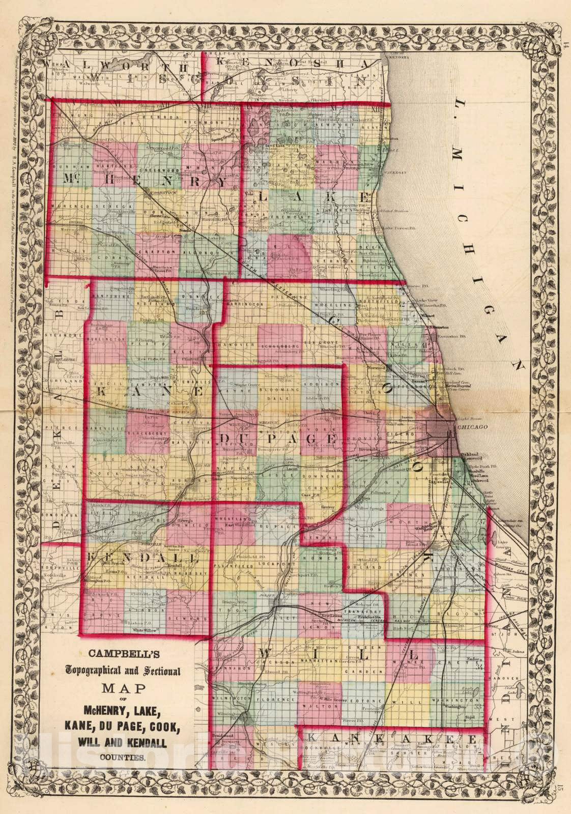 Historic Map : 1870 McHenry, Lake, Kane, Du Page, Cook, Will, Kendall Counties. - Vintage Wall Art