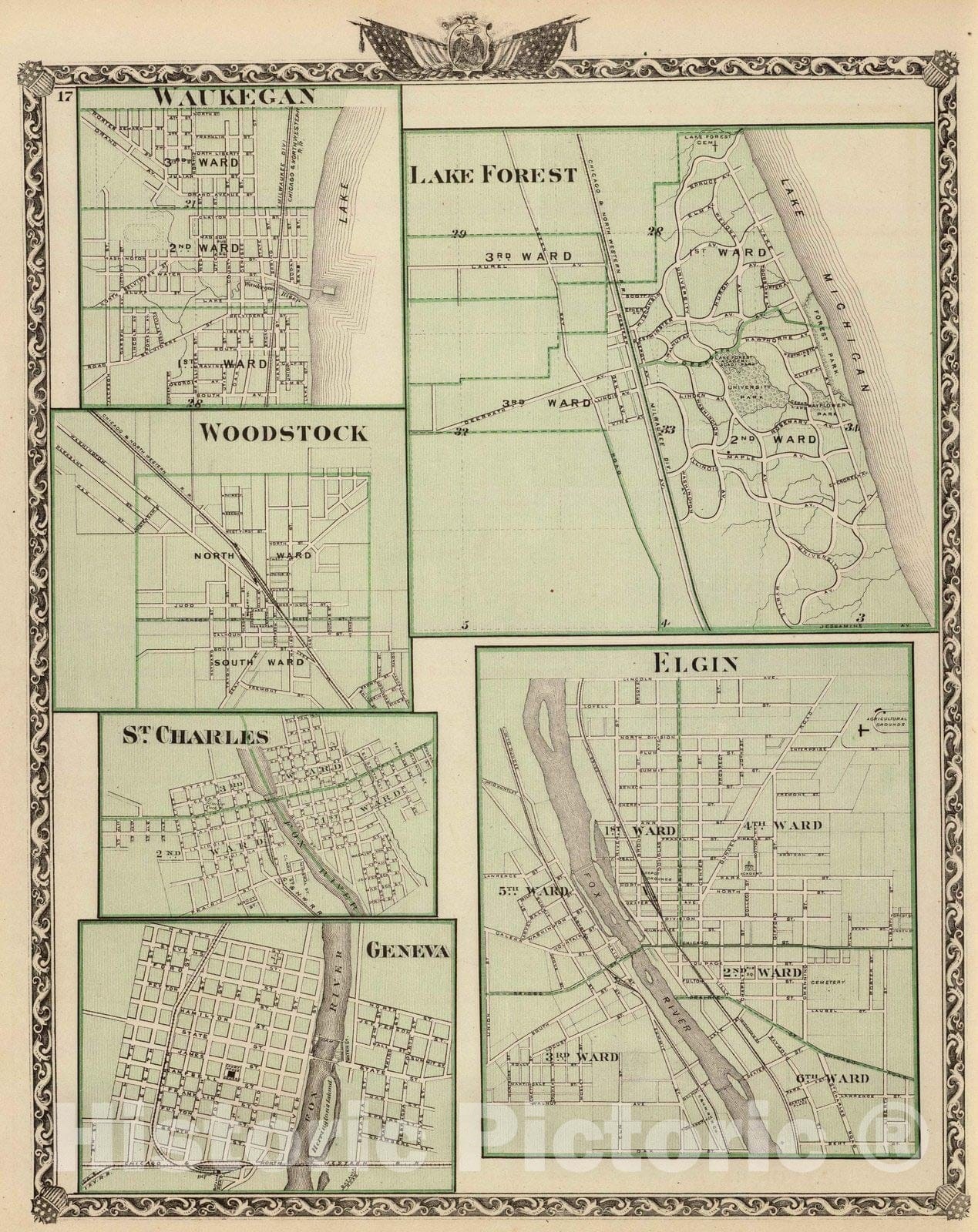 Historic Map : 1876 Lake Forest, Elgin, Waukegan, Woodstock, St. Charles and Geneva. - Vintage Wall Art