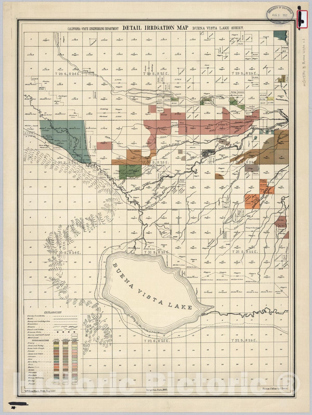 California State Engineering Department. Detail Irrigation Map. Buena Vista Lake Sheet. Wm. Ham. Hall, State Engineer. Irrigation Data 1885. | California State Engineering Department. Detail Irrigation Map(s) (for the San Joaquin Valley). Wm. Ham. Hall, State Engineer. Irrigation Data 1885. | A series of eleven detailed maps, on ten sheets showing townships, ranges and sections, physical and cultural geographical features, ranchos, and irrigation works, including canals, artesian wells, relief, swamps, railroads, roads, dry washes, pipelines, etc. Identifies the holdings of various water and land companies, colonies, and individual landowners. "Irrigated lands" and "Lands for which water is held" are identified. Irrigation systems often differentiated by owner usually a ranch, land company, or colony name. Maps are scanned from the holdings of the Water Resources Center Archives, University of California Library. Mounted on linen.